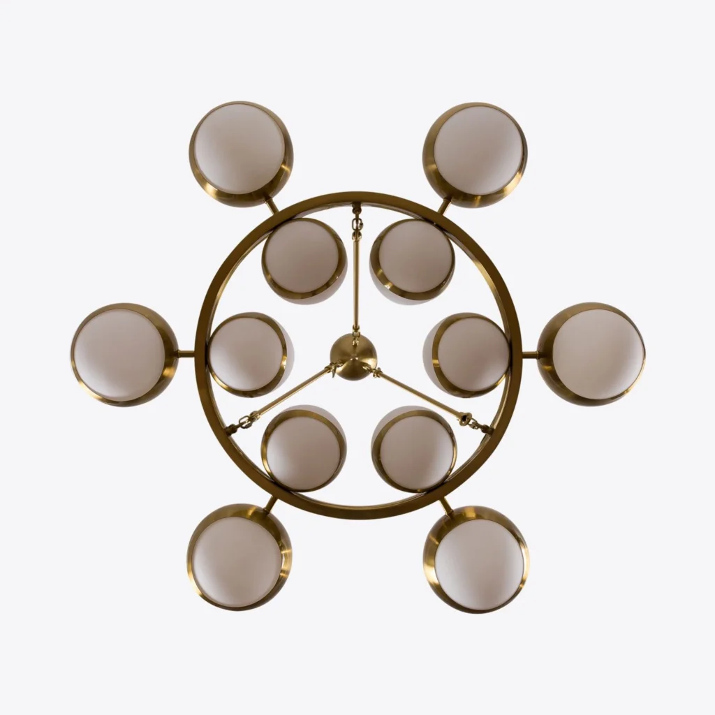 Notre nouveau lustre s’inspire d’un design Murano des années 1970. Disponible en deux tailles, le Lucca se compose de globes en verre opalin disposés à la fois sur le bord intérieur et extérieur de sa structure en finition laiton. La version grande comprend 20 globes, avec 10 petits abat-jours vers le centre et 10 sur le bord extérieur. La version plus petite comprend 12 globes, avec 6 petits abat-jours vers le centre et 6 sur le bord extérieur.