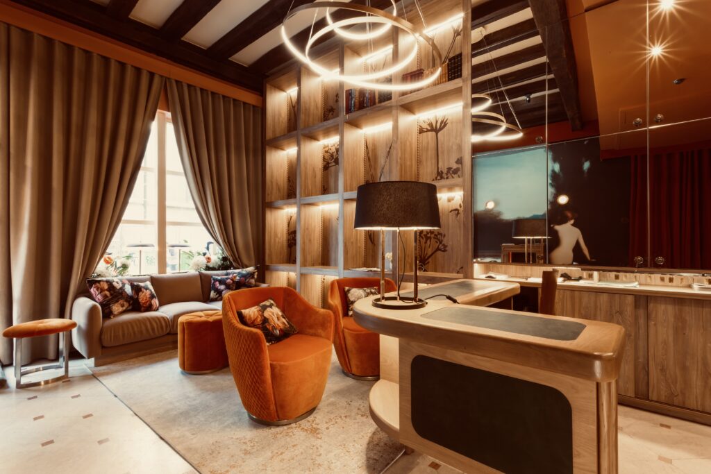 Trouver le style d’un hôtel n’est pas chose aisée. Il faut savoir écouter son client en fonction de son cahier des charges, comprendre ses utilités d’usages afin d’anticiper. Voilà l’objectif principal de l’architecture d’intérieur.Nous avons conçu l’espace dans l’optique de s’y sentir bien et d’avoir un sentiment de confort. Nous avons travaillé un pan de mur comme une ornementation présente sur l’intégralité du mur : une toile tendue d’une représentant un tableau de Jacques Henner. Cette représentation surplombe la salle et met en valeur la hauteur sous-plafond et ses poutres, ses constructions d’autrefois. L’élément fort du projet reste ces décors prévus pour évoluer durant les saisons d’été et d’hiver. L’été le rideau reste ouvert sur ce tableau d’une femme en demi-teinte, L’hiver, la jeune femme est habillée par le rideau en velours orangé qui laisse apparaître son dos à travers une fenêtre originale dans le tissu.Afin de garder l’aspect chaleureux de l’hôtel, nous avons réintégré une cheminée à vapeur d’eau et une grande bibliothèque en bois épousant le versant opposé du mur ou se situe la cheminée. Cette bibliothèque rétro éclairée affiche un dessin floral imprimé dans le bois sur l’ensemble de la bibliothèque qui donne un effet vivant au bois.